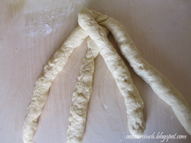 Wyrośnięte ciasto dzielimy na cztery części. Każdą część zagniatamy i tworzymy wałki równej długości. Wałki łączymy z jednego końca. Naprzemiennie zewnętrzny wałek przekładamy nad dwoma sąsiadującymi wałkami.